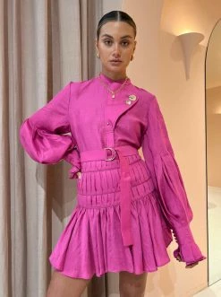 Brighten your days with the Flamingo pink hue of the Wheatland Shirt from Acler. Crafted from a lightweight linen blend in bold Flamingo Pink. This contemporary blouse sits relaxed on the body with a decadent grandfather collar, a concealed placket and long blouson sleeves with panel detailing and gathers throughout. Finished with quintessential Acler gold hardware and a detachable D ring belt, this statement shirt will have you in the spotlight desk to dusk. DETAILS & CARE Fabric: 57% Linen 27% Viscose 16% Nylon – Relaxed fit – Lightweight – Grandfather collar with statement gold button closure – Concealed placket – Long blouson sleeves with panels and gathering details Our Coco girl Eden wears a Size 8 AU / Small. Eden's Height is 175cm. COCO STYLING TIP Complete the set with the matching Acler Bicknell Skirt in Flamingo and style with Alias Mae Cassie Heel in Natural, Reliquia Trending Upwards Hoops in Gold, Amber Sceats Coco Necklace in Gold and Porter Mali Ring Set in Gold.