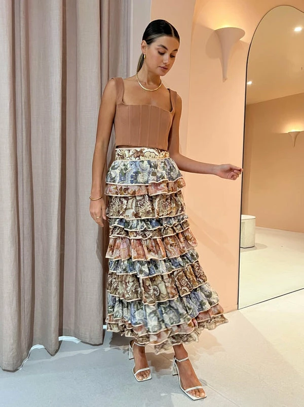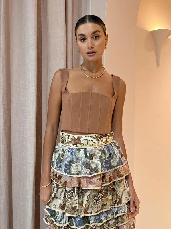 Alemais adds a touch of Modern Romance to your crop collection with the Jodhpur Riding Corset in Tan. Sitting fitted at the bust this corset is thoughtfully crafted from a medium weight cotton blend fabrication. Designed with a square neckline to highlight the décolletage, this flattering cropped corset is panelled and features boning throughout. Admired for its tonal tan colour-way and easy to wear silhouette, Coco girls will be styling this crop for dinner dates, cocktail parties and birthday celebrations. DETAILS & CARE Fabric: 97% cotton 3% spandex – Cropped- Square neckline- Panelling with boning throughout - Metal zip fastening at centre back - Garment is fully lined Our Coco girl Eden wears a size 8 AU/small. Eden’s height is 175cm. COCO STYLING TIP Style this crop with the statement Alemais Phillipa Ruffle Skirt in Mix Floral, Alias Mae Camelia Heel in Bone, Reliquia Baby Coralia in Gold, Arms Of Eve Rae Chain Necklace in Gold, Porter Pond Bangle in Gold and Porter Wave Ring Set in Gold.