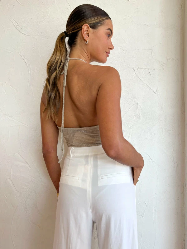 Add a touch of glimmer to your Coco collection with the Ibiza bodysuit in Gold by CAMILLA AND MARC.Crafted from a luxe shimmer fabrication, this fully lined halter neck bodysuit features gathered bust panels with rouleau straps that tie at the back of the neck and soft gathers throughout for a flattering silhouette. Detailed with a conversation-starting front cut out under the bust, Coco girls love to pair this bodysuit with denim or white trousers to elevate their everyday looks. DETAILS & CARE Fabric: 100% Polyester- Halter neck bodysuit with cut out detail- Gathered bust panels with self rouleau straps that tie at the back of the neck- Designed to be worn fitted- Cut out under bust panels- Gathering at side seams to create soft gathers across body- Snap closure on crotch- G-string fit- Fully lined styleCare Instructions: Quality, delicate dry cleaningOur Coco girl Eden wears a size AU 8 / small.Eden’s height is 175cm. COCO STYLING TIP Style with the Camilla and Marc Madrid Pant in Ivory, the Camilla and Marc Vigo Heel in Ivory, the Porter Paris Huggies, the Arms of Eve Helios Cuff Bracelet in Gold, the Porter Chunky Belcher Bracelet in Gold, the Porter Wave Ring Set in Gold and Porter Pond Ring in Gold.