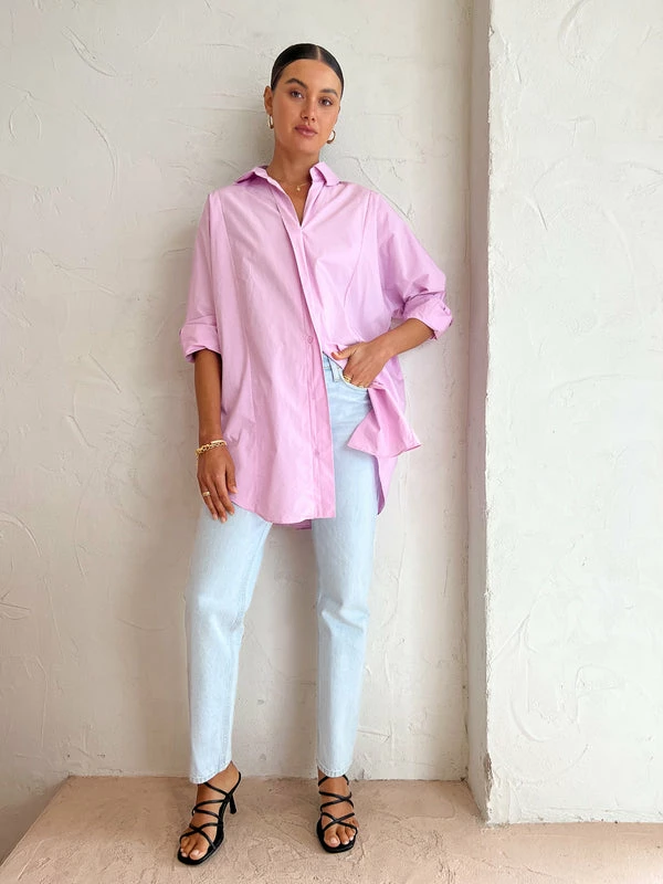 Add a touch of Summer to your Coco wardrobe with the Kinney Bianka Shirt in Violet. Crafted from a crisp Cotton, this oversized shirt features a double collar design with concealed button-up closure and double button hemline that is detailed with a scoop hem that sits longer at the back. Designed to elevate your everyday repertoire, this shirt will add a pop of colour to your desk-to-dusk wardrobe with endless styling possibilities. DETAILS & CARE Fabric: Main: 100% Cotton- Relaxed oversized shirt- Double collar design- Concealed button up closure- Double button hem- Scoop hemline- Long sleeve Care instructions: Cold hand wash separately. Dry cleanable. Our Coco girl Eden wears a size AU 8 / small.Eden’s height is 175cm. COCO STYLING TIP Complete the look with the Nobody Phoebe Jean in Dreamy Blue, LMS The Violet in Black, By Charlotte Path of Life Necklace in Gold, Reliquia Baby Coralia Hoops in Gold, Reliquia Coralia Hoops in Gold, Amber Sceats Helena Bracelet in Gold, Porter Triple Heirloom Ring in Gold and the By Charlotte Align Your Soul Ring in Gold.