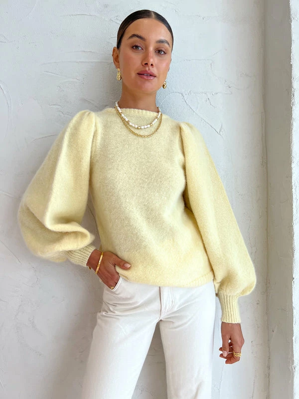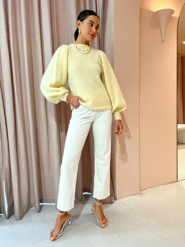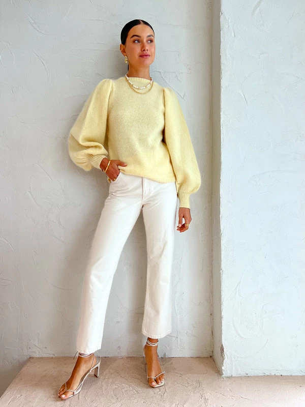 Prepare for the cooler months with the Kinney Kiki Jumper in Butter Lemon. Delicately crafted from a wool blend, this gorgeous knitted jumper features a high neckline with balloon sleeves that are cuffed at the hemline. Adored for its buttery citrusy hue and soft woollen blend, the Kiki jumper is the perfect addition to your Coco wardrobe for the cooler months ahead. DETAILS & CARE Fabric: Main: 32% Mohair, 28% Wool, 40% Nylon- Knit jumper- Slight stretch- Balloon sleeves- High neckline- Puffy shoulder- Cuffed wrist hemlineCare instructions: Dry clean only. Our Coco girl Eden wears a size AU 8 / small.Eden’s height is 175cm. COCO STYLING TIP Complete the look with the Nobody Hardy Jean in Milk, Alohas Bellini Heel in Ivory, Amber Sceats Klein Earrings in Gold, By Charlotte Dream Weaver Cuff in Gold, By Charlotte Stardust Cuff in Gold, Arms of Eve Rae Chain Necklace in Gold, Arms of Eve Juliet Pearl Necklace and the Amber Sceats Electra Ring Set in Gold.