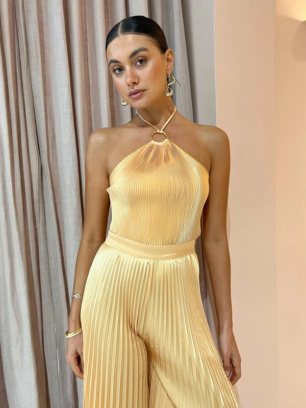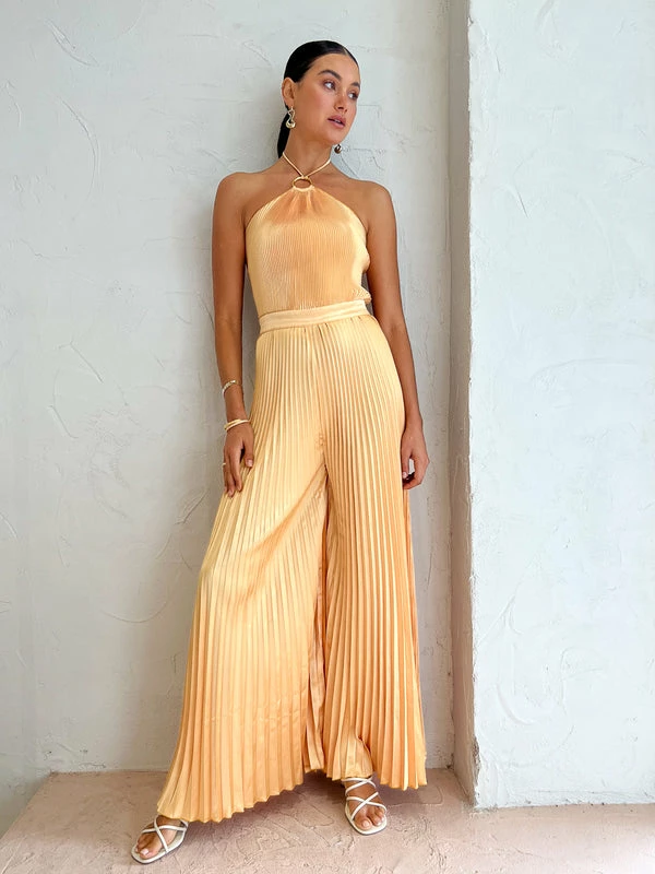 Elevate life's special moments with the L'IDEE Reveil Jumpsuit in Mango. Designed with a signature ribbed pleating in a vibrant Mango hue. The Reveil Jumpsuit features a halter neckline, a cinched waistline before falling into an umbrella pleat wide leg. A re-defined Coco favourite, this jumpsuit will add a new flare to your summer wardrobe for upcoming birthday celebrations, summer soirees and balmy evenings. DETAILS & CARE Fabric: Main: 100% High-grade polyester- Halter neckline with O-ring- Full-length jumpsuit- High waisted- Wide leg silhouette- Fitted waist- Sleeveless- Umbrella pleat leg- Centre back waist invisible zip closure- Rouleau loop and button closure at the backPlease note: Pleating is an art and each item is unique and delicate. Small imperfections naturally occur. Our Coco girl Eden wears a size AU 8 / small.Eden’s height is 175 cm. COCO STYLING TIP For your next special occasion, style with the LMS The Violet in White, Alemais Infinity Earrings in Gold, Amber Sceats Electra Ring Set in Gold, Amber Sceats Hunter Bracelet in Gold, By Charlotte Dream Weaver Cuff in Gold and the By Charlotte Align Your Soul Ring in Gold.