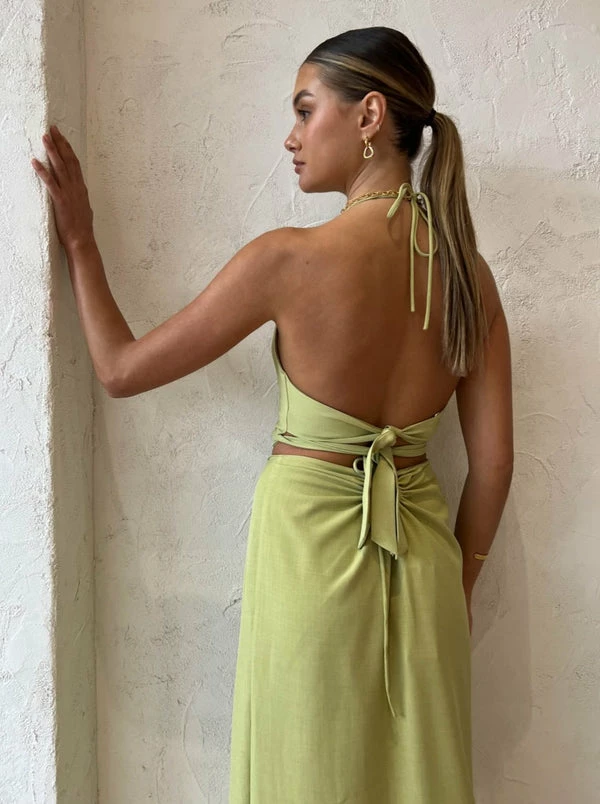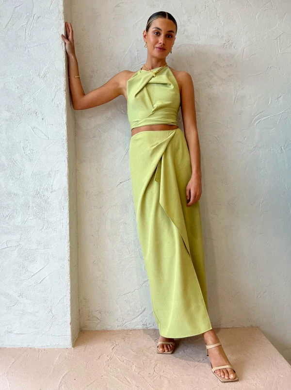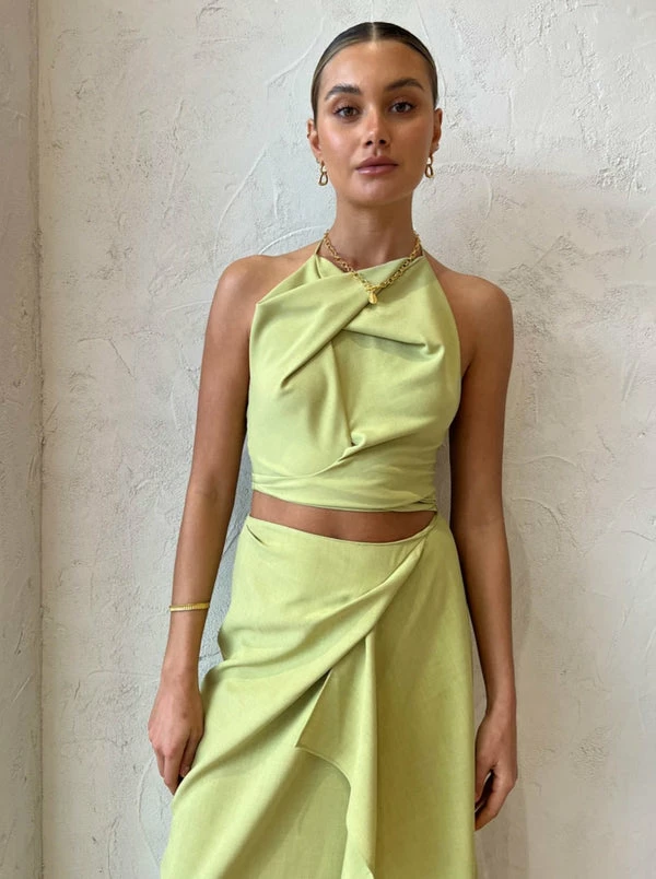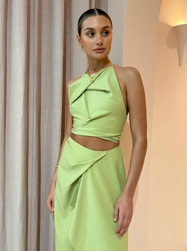 The One Fell Swoop Cult Crop in Grass is cropped to perfection and will to invigorate your Coco Wardrobe.Crafted from luxurious poly blend fabrication, this wrap silhouette crop feature a high halter cross drape neckline that fastened at the back of the neck. Finished with a double tie feature at the exposed back, this crop is finished in a pastel grass hue designed to brighten up your Coco occasion. DETAILS & CARE Fabric: 97% Polyester 3% Spandex- Wrap style silhouette – Cropped length- Halter neckline with thin ties- Crossover drape detail at the bust- Double tie feature at back Care Instructions: Gentle cool hand wash, do not bleach or wring, do not tumble dry, dry flat warm iron on reverse side, dry clean with care.Our Coco girl Boston wears a Size 8 AU / Small.Boston's Height is 178cm COCO STYLING TIP For special Coco occasions complete the set with the matching Review Skirt in Grass and style with Alias Mae Cassie Heel in Natural, Reliquia Lucille Earrings in Gold, Arms Of Eve Rae Chain Necklace in Gold and Amber Sceats Hudson Bracelet in Gold. Transition to weekend drinks styling the Cult Crop with the Nobody Agnes Jean in Reveller, the Camilla and Marc Twister Flat Sandal in Black, Porter Marli Ring Set in Gold.