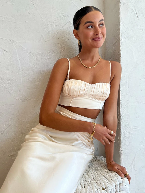 Invest in mix-and-match styling for every special Coco occasion with the Corded Bralette in Cream by Shona Joy. Crafted from a silk touch fabric with a luxurious sheen, this top features ruched corded detailing at the bust, removable, adjustable rouleau straps and a centre back zip. Adored for its flattering sweetheart neckline, pair it with the matching Ruched maxi Skirt in Cream to add a touch of glam to your Coco diary moments. DETAILS & CARE Fabric: Main: 58% Lenzing™ Ecovero™ 42% Viscose Lining: Polyester- Silk touch fabric- Luxurious sheen- Sweetheart neckline- Removable adjustable rouleau straps- Ruched corded detail at bust- Centre back zip- Medium weight, non-stretchy wovenCare Instructions: Cold hand wash separatelyOur Coco girl Eden wears a size AU 8 / small.Eden’s height is 175cm. COCO STYLING TIP Complete the look with the Alias Mae Molly Heel in Cream, , Porter Chunky Belcher Bracelet in gold, Amber Sceats Diana Ring in Gold, Arms of Eve Rae Chain Necklace in Gold, Amber Sceats Lane Ring in Gold, Amber Sceats Bella Earrings in Gold, and the Amber Sceats Helena Bracelet in Gold.