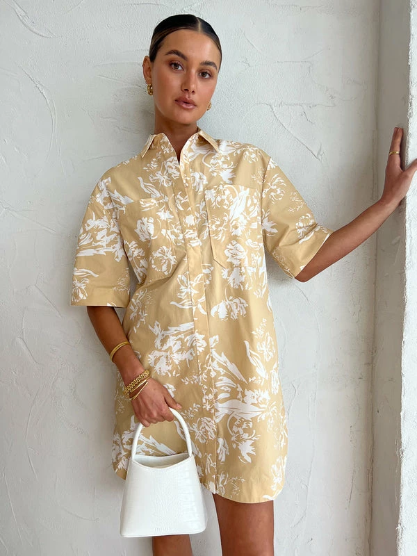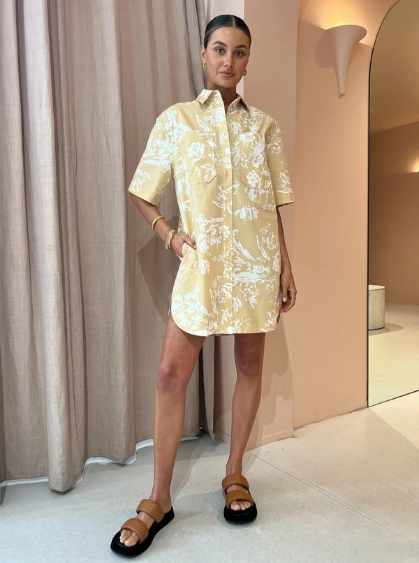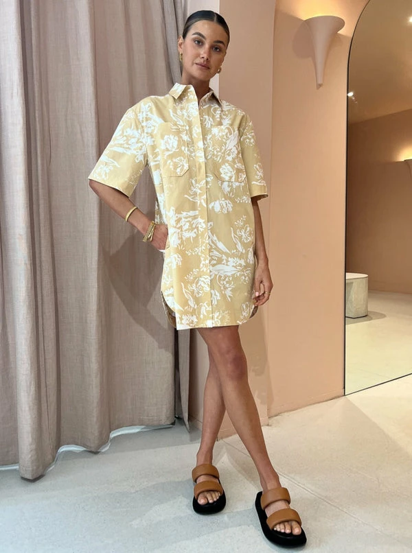 Escape to Palm Springs with the Farrah Short Sleeve Oversized Shirt Dress in Sand/Ivory from Shona Joy. Crafted in 100% Organic Cotton, this oversized shirt dress features a shirt collar, front breast pocket and concealed front button closure. Adored for the laidback luxe shirt dress silhouette, this mini dress is a Coco favourite for days by the beach through to weekend getaways. DETAILS & CARE Fabric: 100% GOTS Certified Organic Cotton- Exclusive Farrah print – Shirt collar- Short sleeve- Front breast pocket- Concealed front button closure- Curved hemline with side splits- Mini length- Medium weight, non-stretchy wovenOur Coco girl Eden wears a size AU 8 / small.Eden’s height is 175cm. COCO STYLING TIP Style with the Alias Mae Poe Slide in Tan, Porter Waver Croissant Ring in Gold, Porter Heirloom Bangle 6mm in Gold, Porter Baby Link Bracelet in Gold, Porter Hailey Twist Necklace in Gold, Reliquia Thalia Ring in Pearl/Gold, Porter Spiral Hoops in Gold, Porter Triple Heirloom Ring in Gold and the Brie Leon Chloe Bag in White Brushed Recycled Croc.