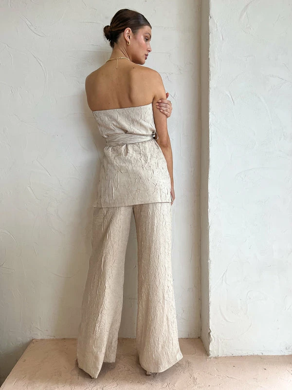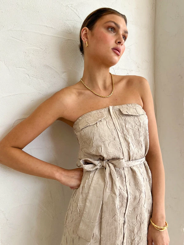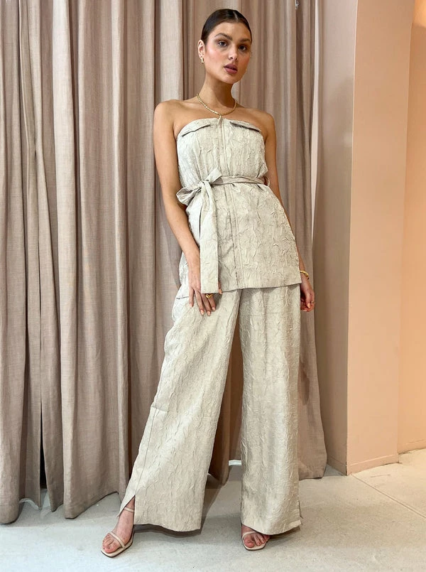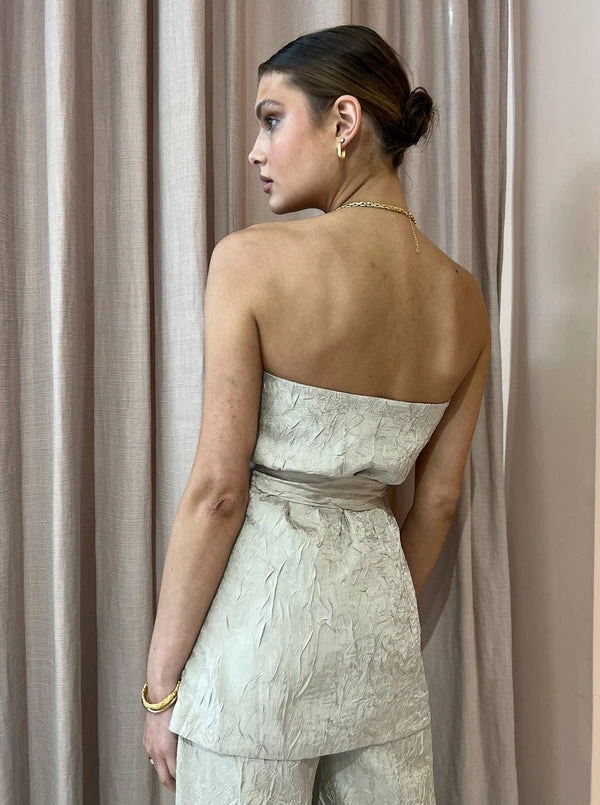 Tojhà heroes effortless design in luxe resort styling with the Penelope Bustier Top in Oyster. Designed to sit relaxed on the body, this soft style bustier top is crafted from a polyester fabrication in Oyster. Fitted to the body with non slip gel tape at the neckline and a centre front concealed zip closure, it features faux front pockets and a detachable waist belt to accent the waistline. Its contemporary crinkle finish excels the Penelope Top to hero status, as Coco's go-to for no-fuss desk to dusk styling and destination dressing. DETAILS & CARE Fabric: 100% Polyester – Strapless bustier – Crinkle textured fabrication – Detachable waist belt – Faux front pockets – Function CF open end zip – Non slip gel tape at neckline – Fully lined Our Coco girl Ella wears a size AU 8 / small.Ella’s height is 178cm. COCO STYLING TIP For desk to drinks, complete with the matching Scarlet Pant in Oyster and elevate with subtle glamour accessorising with a pair of Alias Mae Baz Heels in Cream, the Arms of Eve Rae Chain Necklace in Gold, Arms of Eve Helios Cuff in Gold and the Anya Ring in Gold and White.