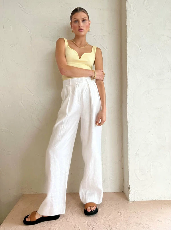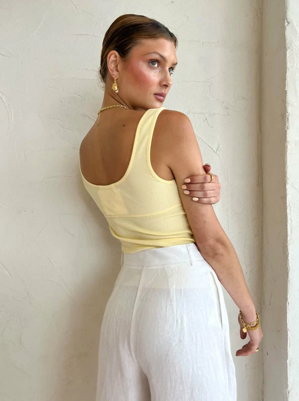 The Viktoria & Woods Dorian Top in Lemon Marle is a refreshing addition to Coco's mix-and-match wardrobe. Crafted from a stretchy Organic Cotton blend, this fitted tank flatters the femme form with a structured bustier and wide straps. Finished in a soft and subtle rib texture, the Dorian is a timeless hero for day to night styling all year long. DETAILS & CARE Fabric: 57% Organic Cotton 42% Polyester 1% Elastane – Fitted – Bra-friendly – Decorative stitch detailing – Structured bustier Care Instructions: Cold hand wash. Dry flat in shade. Cool iron. COCO STYLING TIP Complete this elevated desk to dusk ensemble with the Gyre Coral Pants in Blanc, the Alias Mae Poe Sandal in Tan, Arms Of Eve Rae Chain Necklace in Gold, Porter Baby Link Bracelet 2.0 in Gold, Reliquia Sevilla Earrings in Gold and the Brie Leon Paloma Mini Tote Bag in White Brushed Recycled Croc for all your Coco essentials.